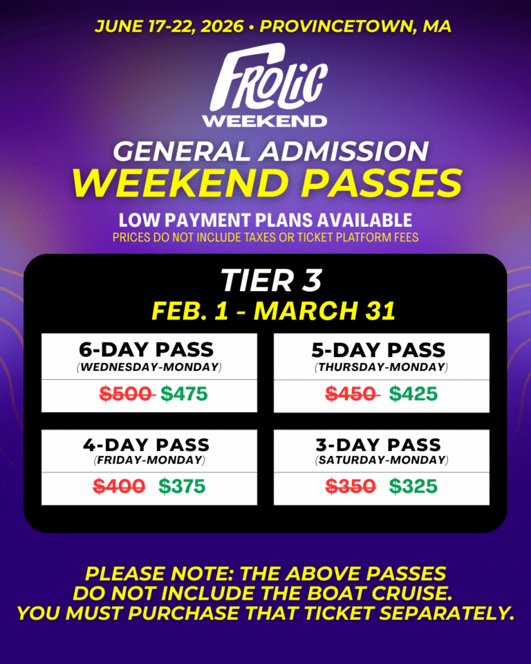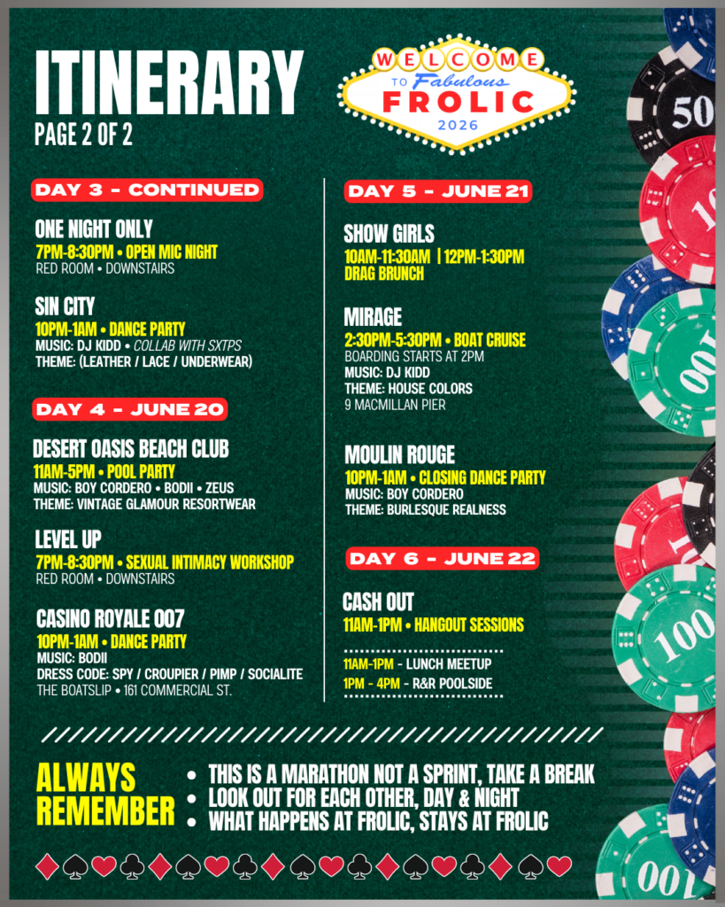 Yoga, boat cruises, unforgettable dance parties, mixers, and more await around every corner–making every choice a winning one. So whether this is your first gamble or you’re a returning high-roller, there’s a seat at the table just for you! All that’s left to do is roll the dice, take the leap, and make Frolic Weekend your playground.
