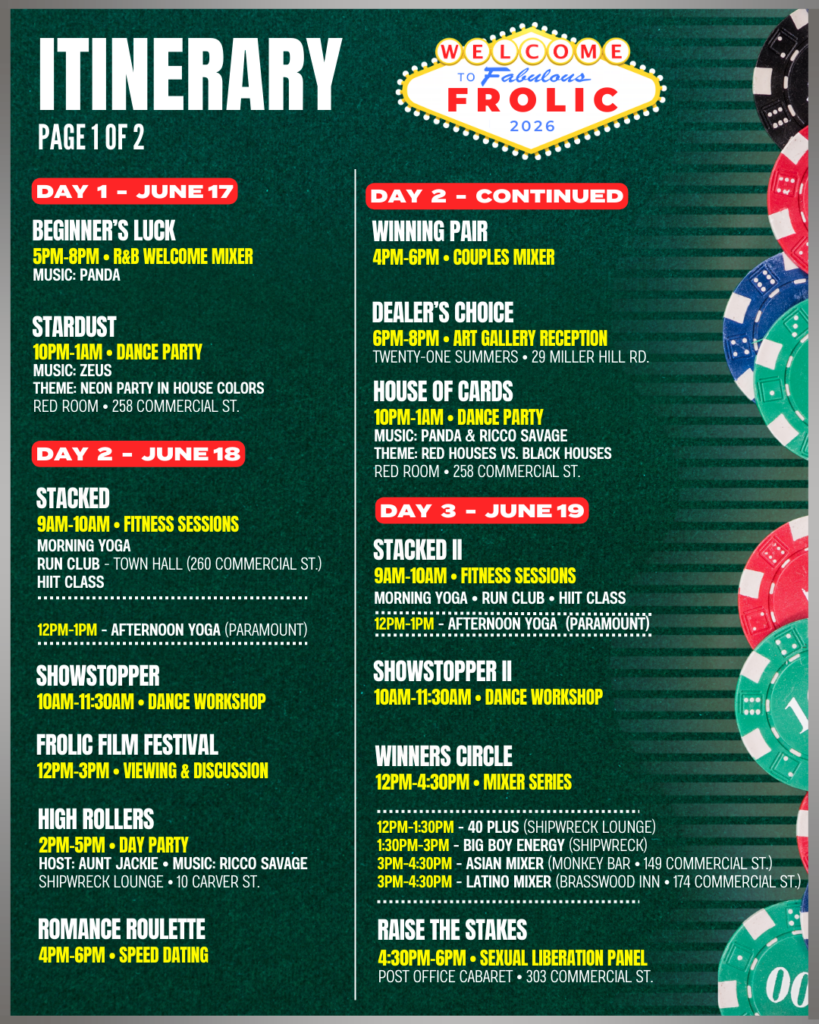 This year, Frolic Weekend transforms Provincetown into Lucky Harbor–a world where the Strip’s energy meets seaside magic. From sun-soaked streets to neon-lit nights, Lucky Harbor deals a full deck of experiences, each one a chance at a jackpot of joy.